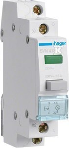 Łącznik przyciskowy 16A, 1Z, z zieloną lampką sygnaliz.230V AC o numerze katalogowym  SVN413 w kategorii Pozostała aparatura modułowa, Aparatura modułowa. Produkt wyprodukowany przez markę HAGER.