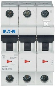 Wyłącznik nadprądowy serii 10kA 3-biegunowy FAZ-K63/3 o numerze katalogowym  278917 w kategorii Wyłączniki nadprądowe 15kA, Wyłączniki nadprądowe. Produkt wyprodukowany przez markę EATON, seria FAZ.